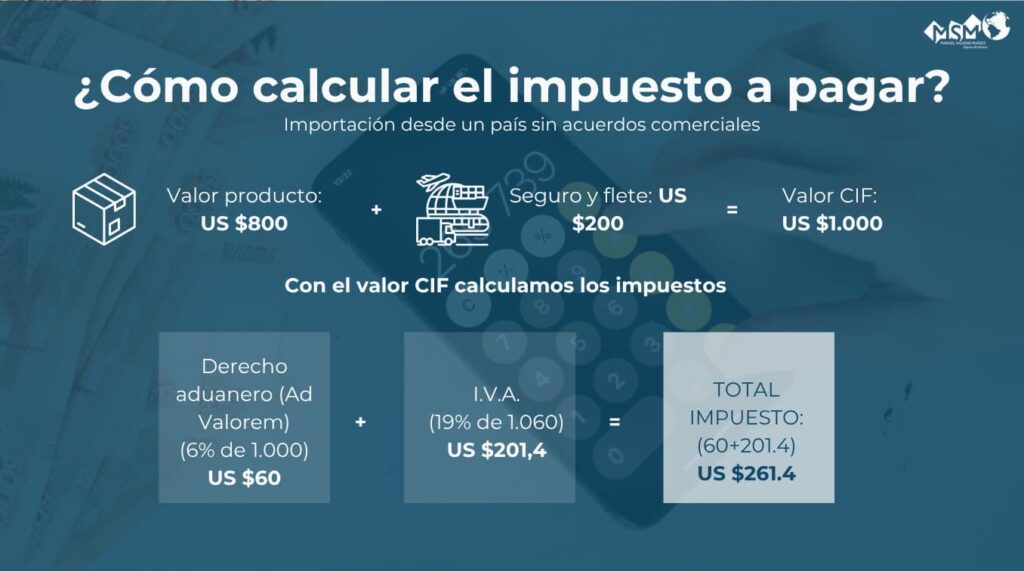 Fórmula del IVA: (Valor CIF + Derecho Ad-Valorem) x 19%.